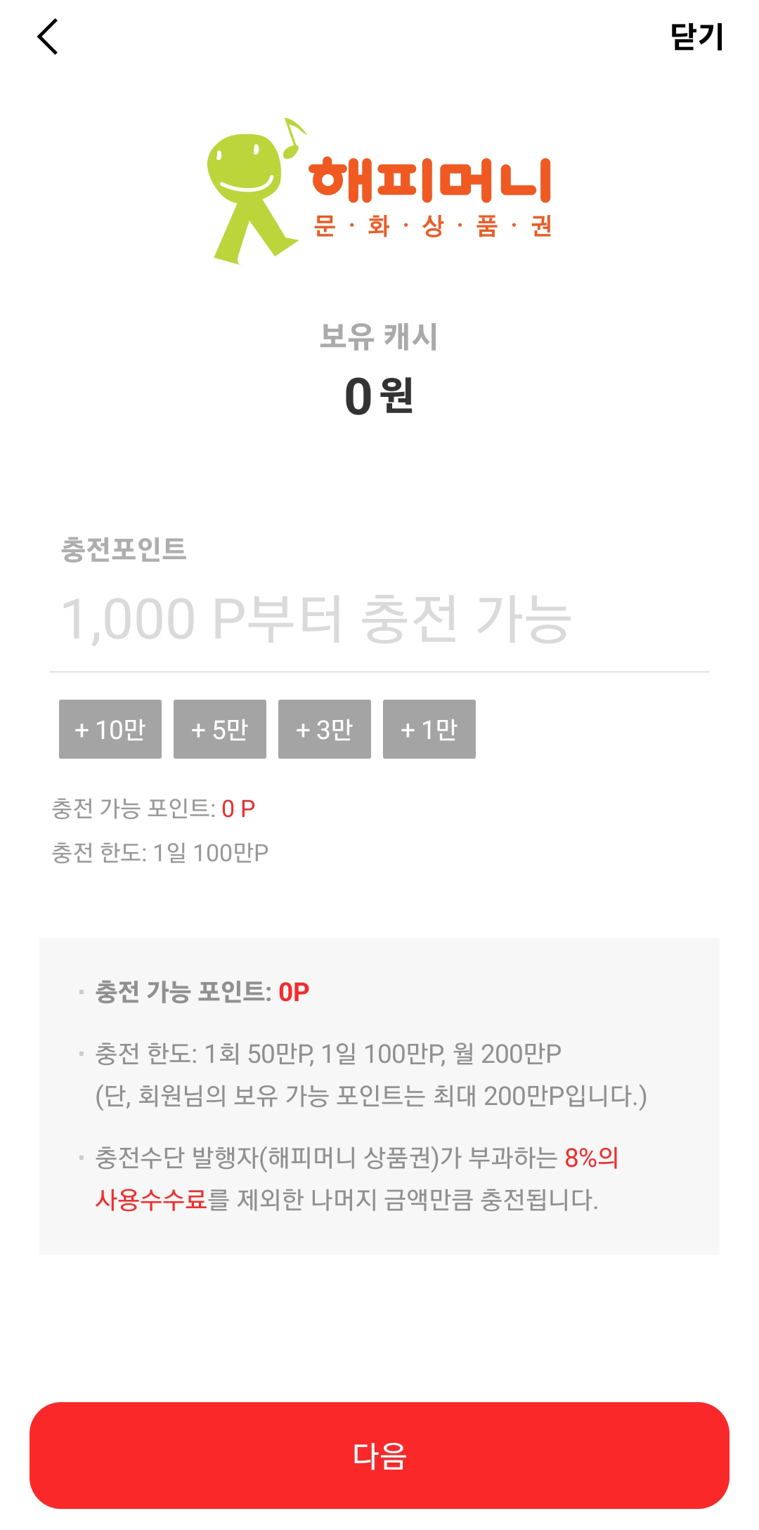 - 해피머니 로그인(아이디/결제 비밀번호) > 충전포인트 입력 > 다음 터치
