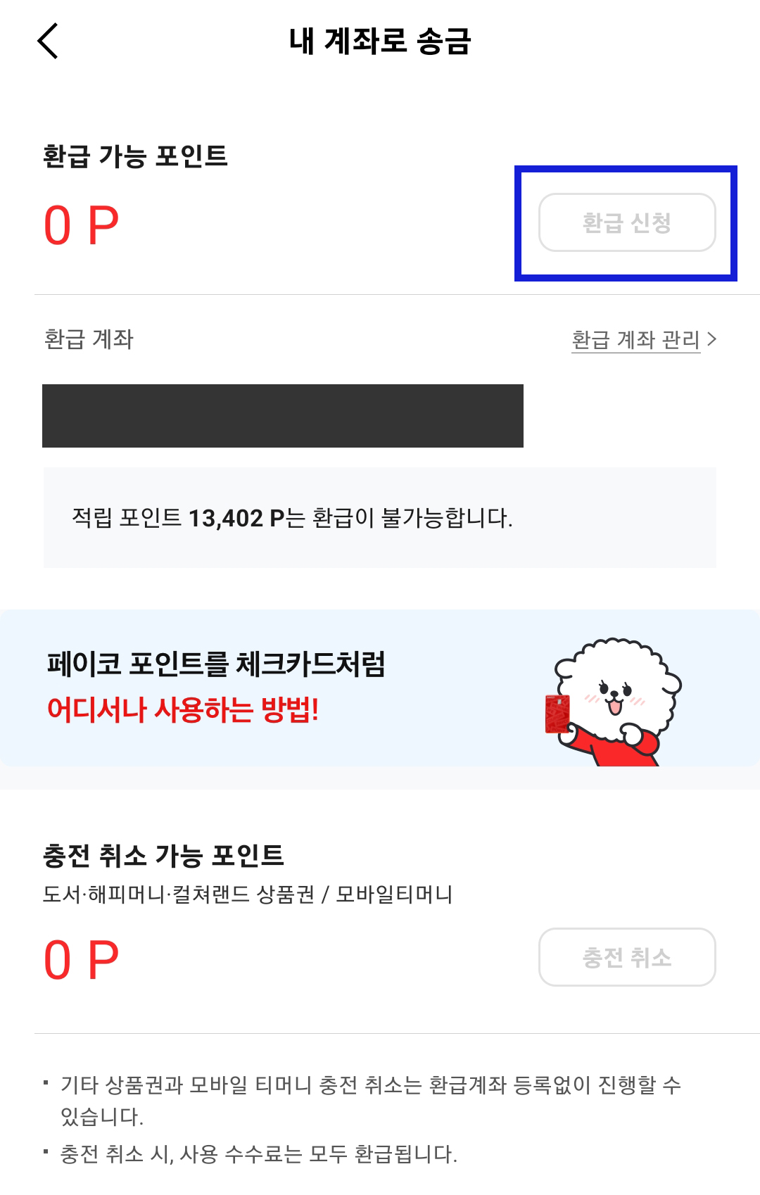 - 하단 포인트 터치 > 내 계좌로 송금 터치 > 환급 신청 터치
