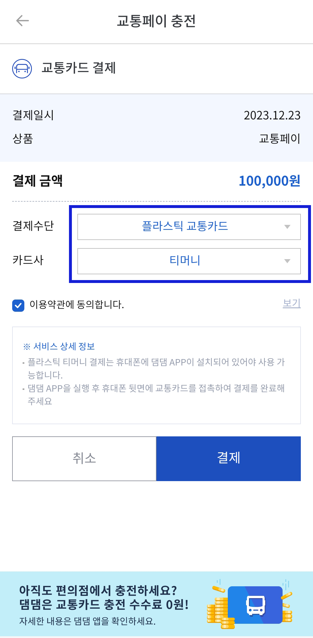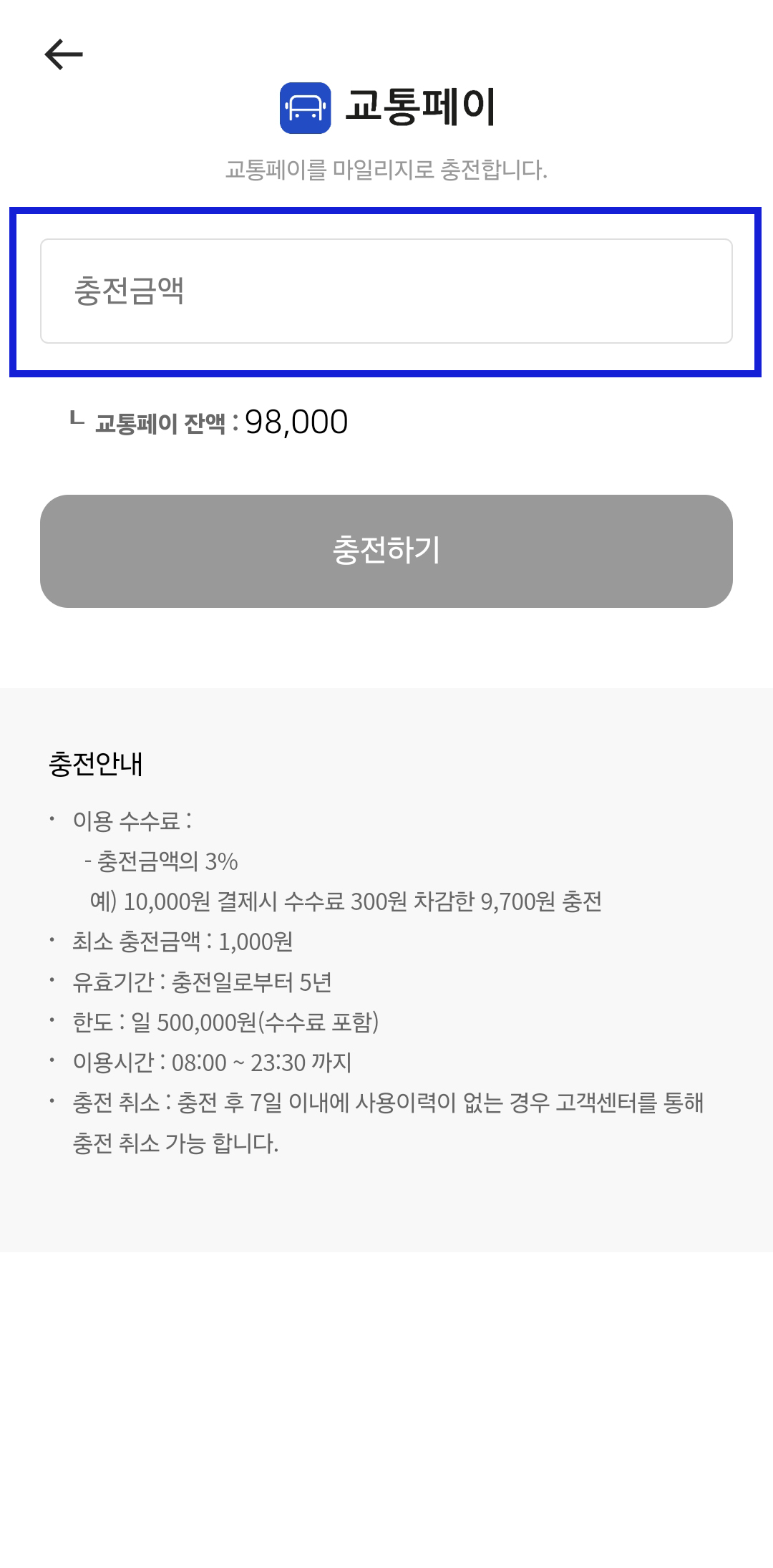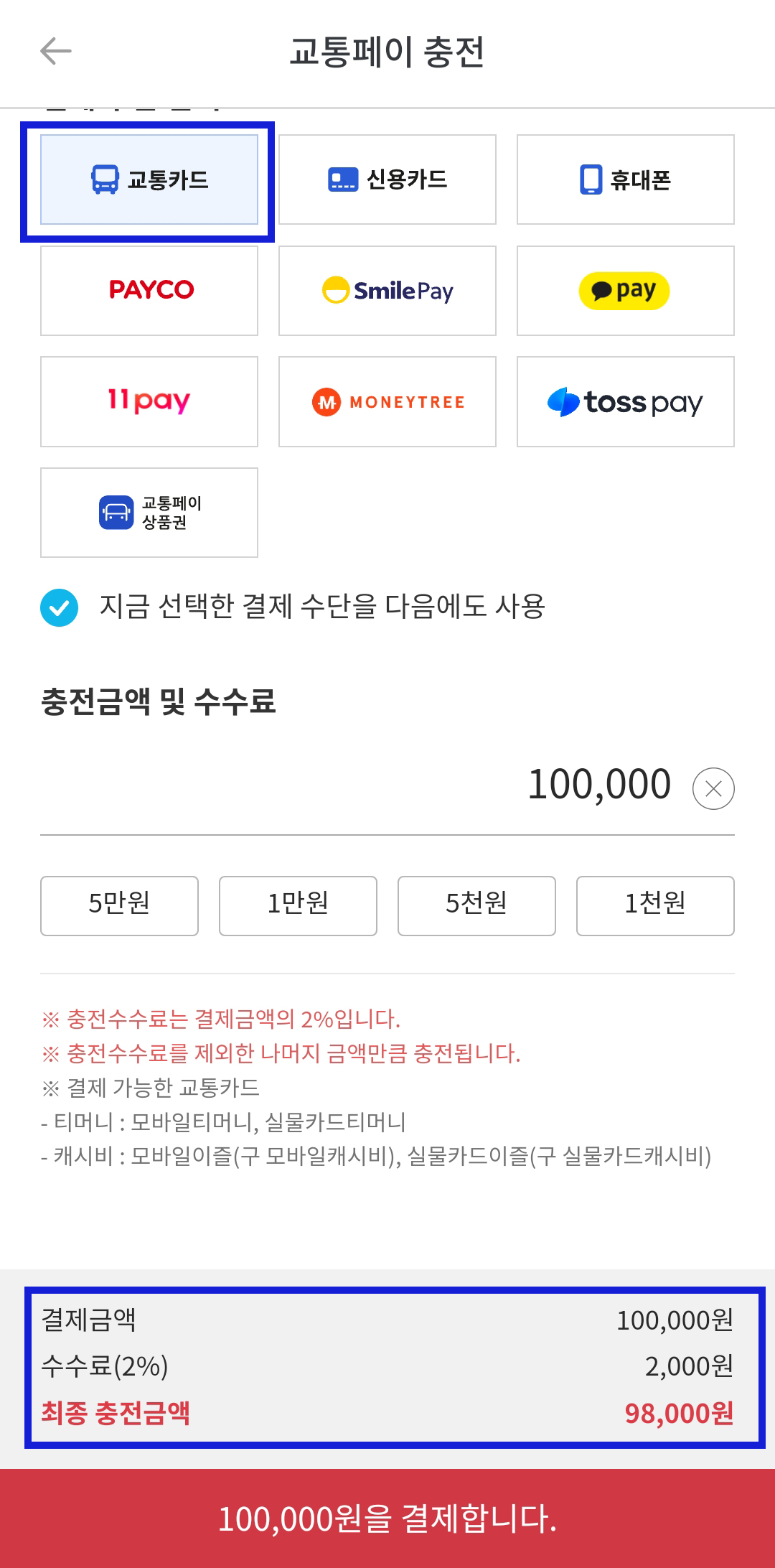 우선 현금화를 하기 위해서는 무조건 교통페이로 충전된 금액을 전환해야 됩니다. 교통페이 전환도 댐댐어플에서 가능하며, 혹시나 가입이 안되어 있으신 분들은 가입을 해주시면 됩니다. 교통페이 충전 수수료는 2%입니다. 댐댐 어플의 교통페이가 로그인이 된 상태에서 충전을 눌러주세요. 교통페이 충전 수담에서 교통카드를 눌러서 충전할 금액을 입력합니다. 저는 10만 원을 입력했고 수수료가 2% 부과되어 실제 결제되는 금액은 10만 원이고, 충전되는 금액은 98,000원입니다.