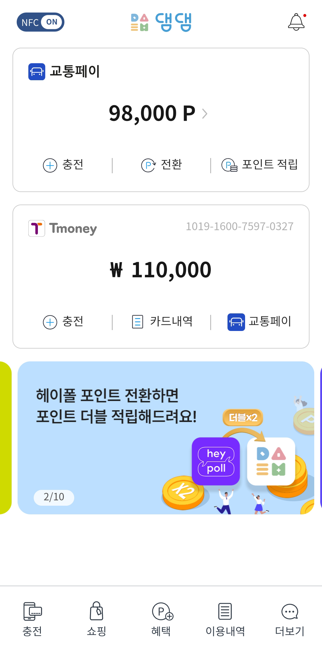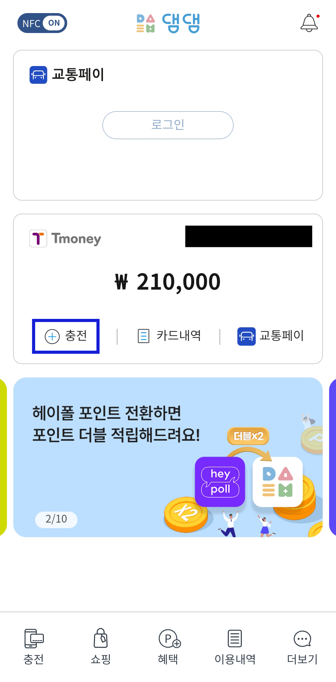그러면 카드 안에 있는 잔액이 나타납니다. 교통페이 부분은 나중에 현금화를 할 때 사용할 부분이니 지금은 넘어가주세요! 카드를 터치한 뒤 아래의 충전을 눌러 충전화면으로 넘어갑니다.
