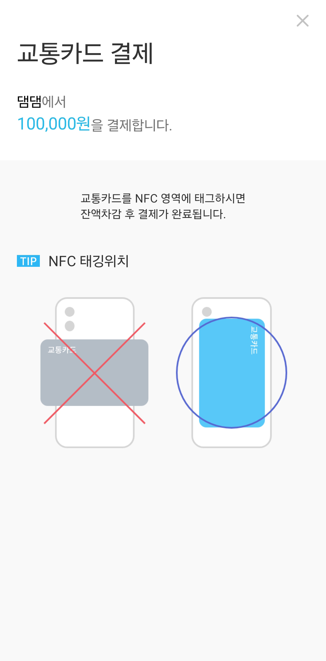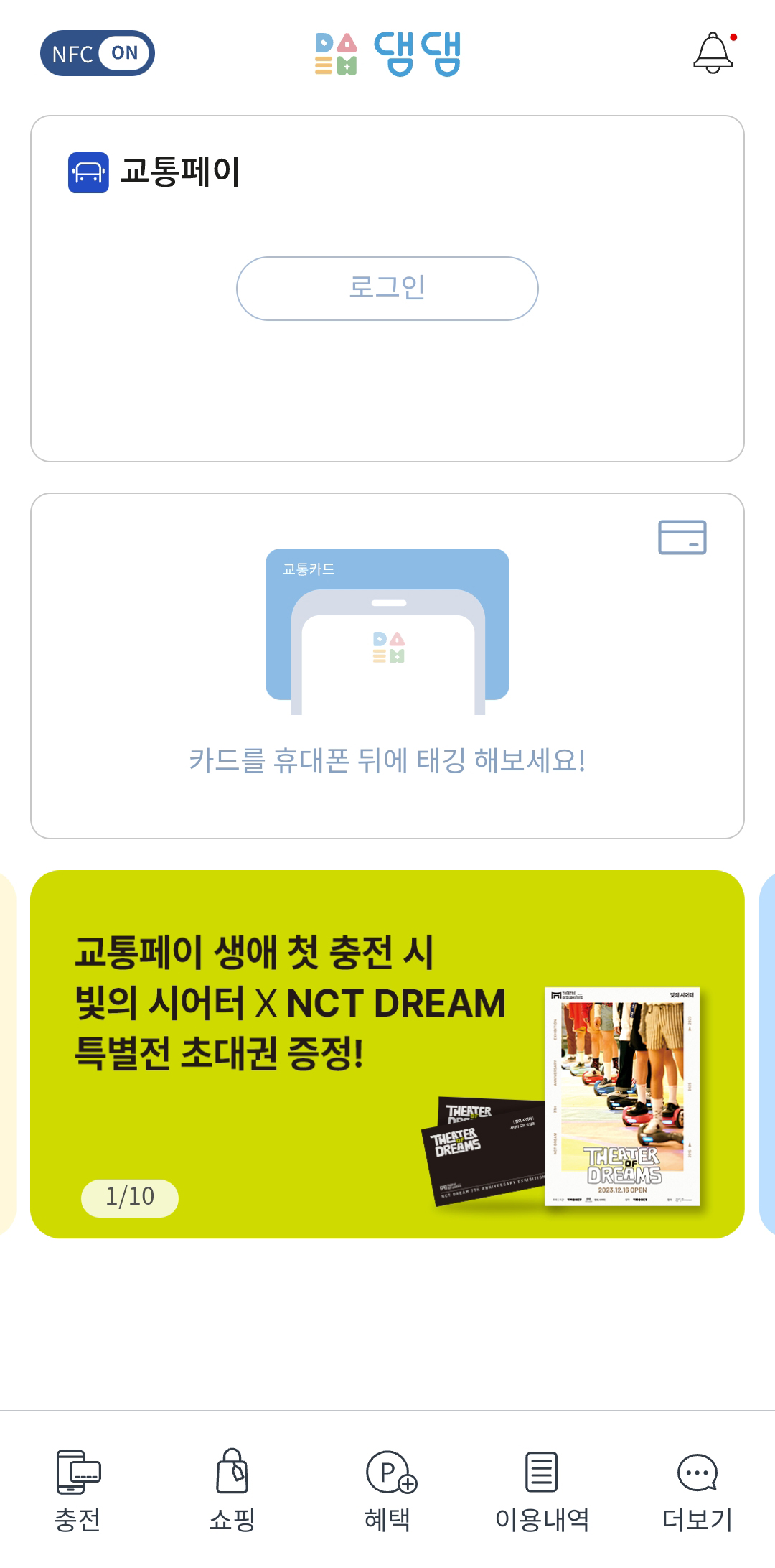 우선 댐댐을 충전하기 위해서는 실물카드가 필요합니다. 댐댐 어플을 실행하고 휴대폰 뒷면에 카드를 터치해 주세요.