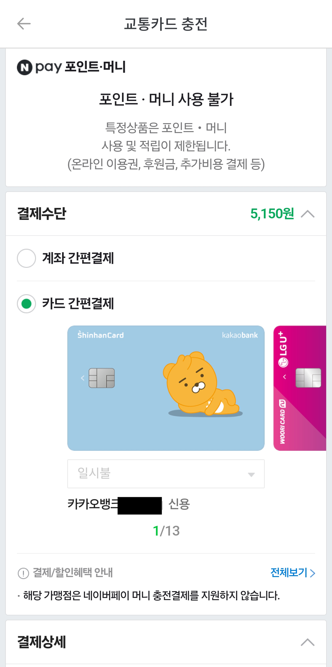 대부분의 충전방법은 충전 시 수수료를 부과하고 있습니다. 3~6%로 다양하지만 많은 분들이 사용하는 이유는 수수료보다 이득이 많아서겠죠? 네이버페이의 경우 3%의 수수료가 부과되어 5,000원 충전 시 5,150원이 결제됩니다.