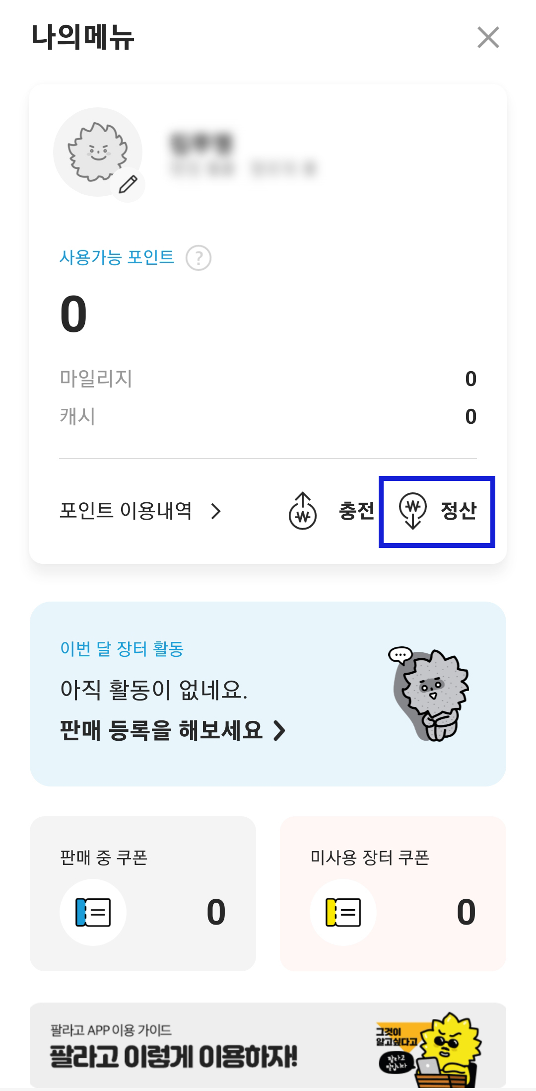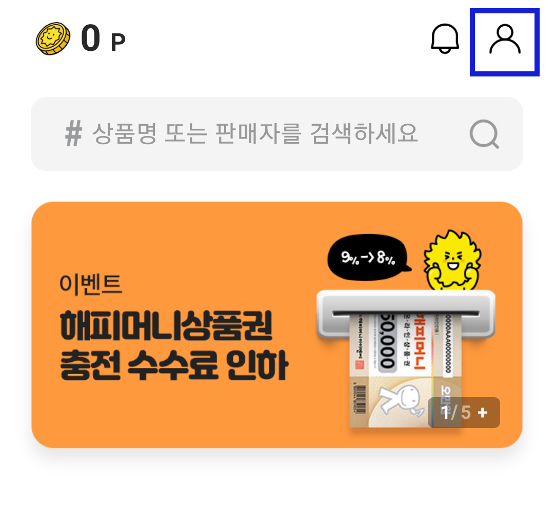 북캐시로 팔라고 충전을 하셨다면 충전된 금액을 현금화해 보겠습니다. 어플 메인으로 돌아가서 우측 상단의 사람 모양을 터치하면 나의 메뉴에서 충전된 팔라고 포인트를 확인할 수 있습니다.