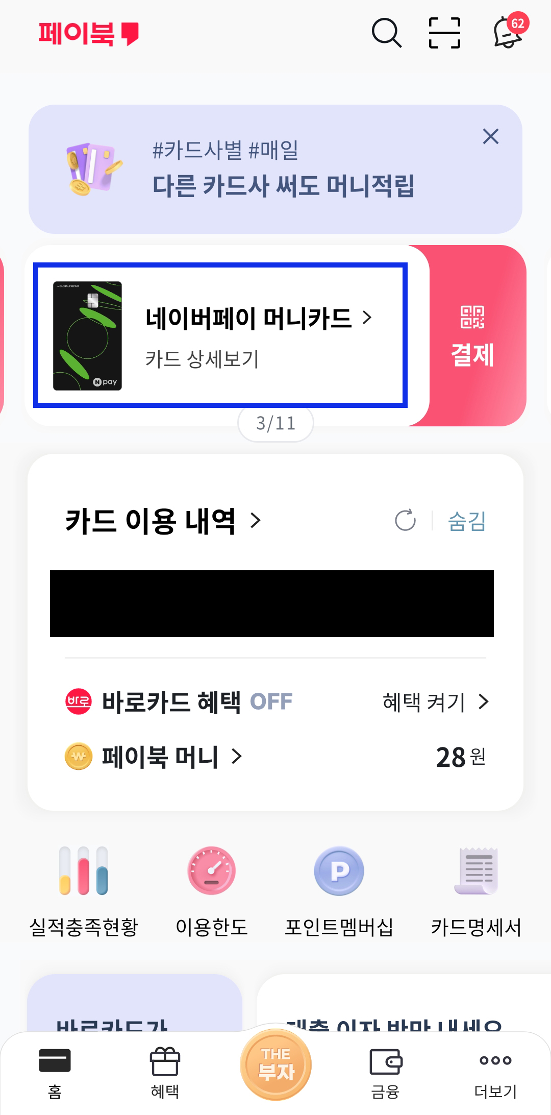 페이북 어플에 접속해 주시고 회원가입 후 로그인을 해주시면 됩니다. 카드 추가를 누르시면 발급받은 네이버페이 머니카드가 자동으로 들어왔는 것을 확인할 수 있습니다. 페이북 카드를 등록하시면 이렇게 메인에서 카드를 확인할 수 있습니다.