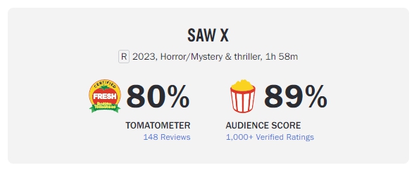 쏘우 시리즈가 계속 출시되면서 팬들은 다소 지루함을 느끼기 시작했습니다. 이번 "쏘우 X" 역시 많은 팬들이 큰 기대를 하지 않았지만 개봉 이후 실제 관객 평가는 전작을 압도하며 국내팬들에게 많은 기대감을 심어주고 있습니다. "쏘우 X" 는 로튼 토마토 기준 신선도 80%, 관객 점수 89%라는 역대 최고의 점수를 기록하였습니다. 또, 미국 개봉일 박스오피스 1위를 기록하며 첫 주만에 1800만 달러라는 흥행을 기록하였습니다. 현재는 전 세계 47개국 박스오피스 1위를 기록하며 1억 달러의 수익을 달성하며, 역대 최고의 성과를 거둘 것이라는 기대가 높아지고 있습니다.