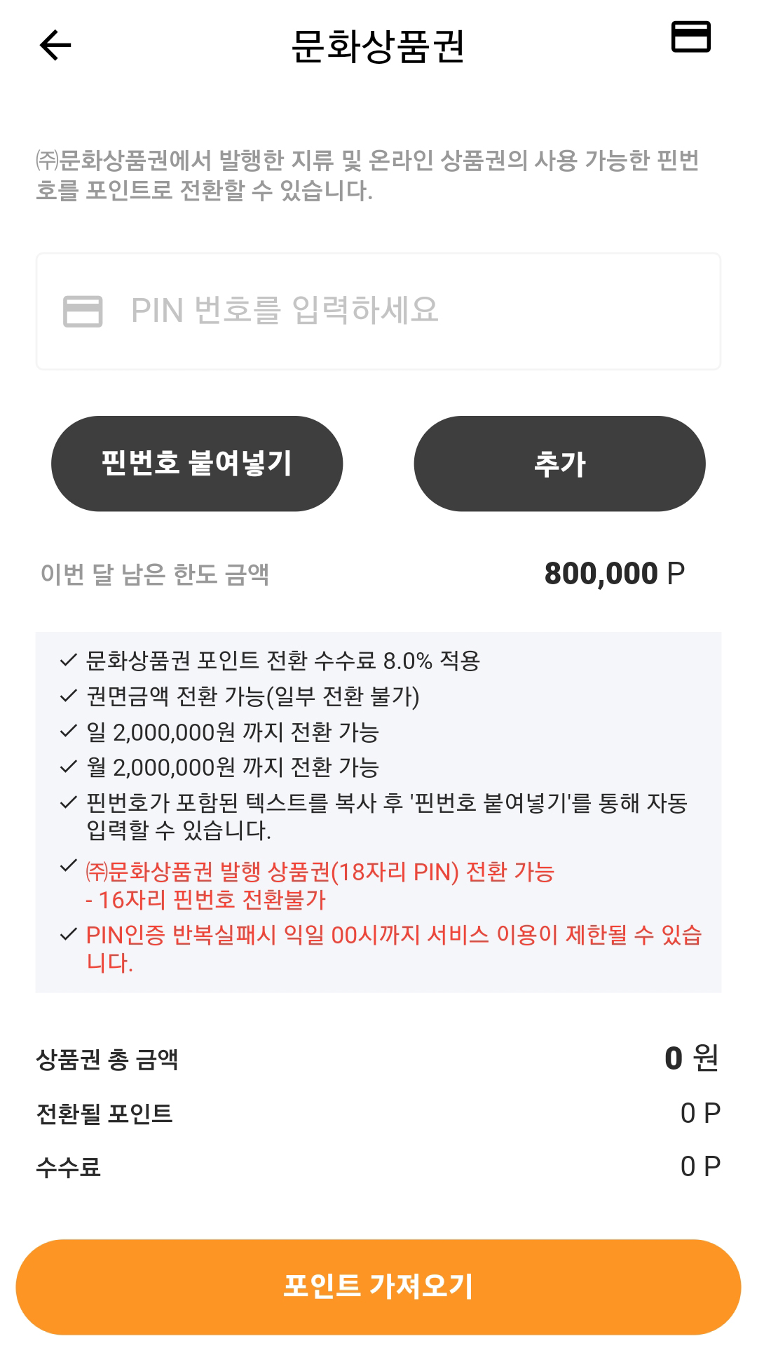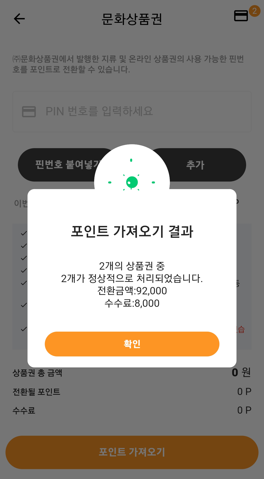 필요한 수량만큼 입력을 마쳤다면 포인트 가져오기를 눌러주시면 충전이 완료됩니다. 정상적으로 충전이 완료되었다면 충전 내역이 표시됩니다. 저는 5만 원권 2장을 충전하여 수수료 8%를 제외한 92,000원이 충전되었습니다.