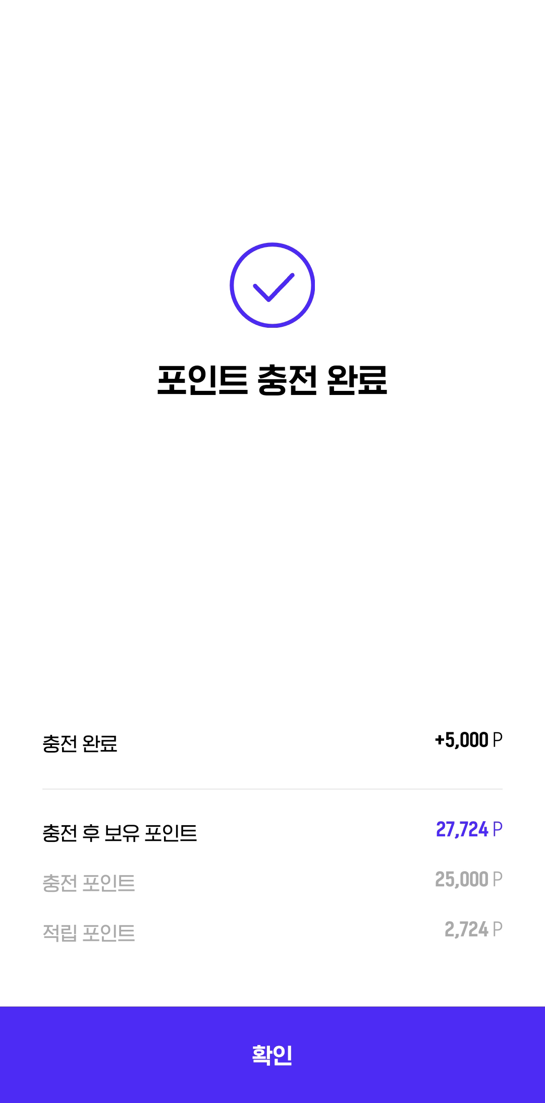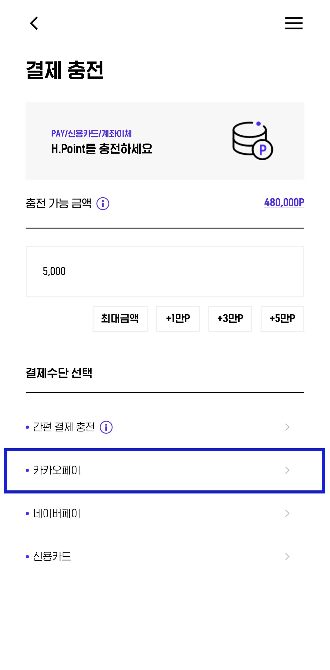 - 어플 상단 포인트 터치 > 스크롤 후 충전하기 터치 > 결제충전 터치 > 카카오페이 결제
