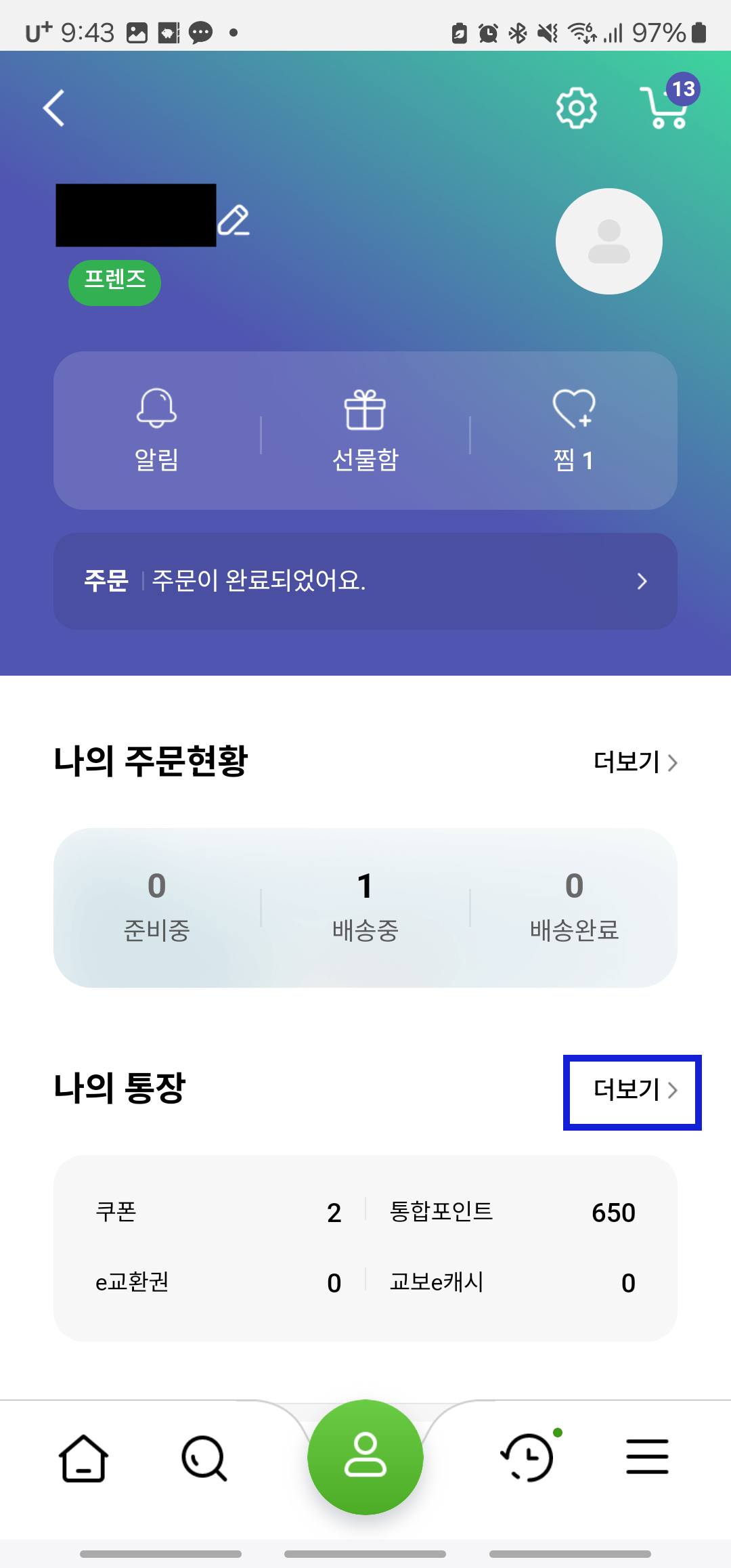 홈페이지를 사용하시든 어플을 사용하시든 충전방법은 동일합니다. 우선 어플로 충전하는 방법을 알려드리겠습니다. 회원가입 후 로그인을 해주시면 아래와 같은 화면을 보실 수 있습니다. 화면의 하단에 있는 사람모양의 버튼을 터치합니다. 그러면 마이페이지로 연결되는데 여기서 나의 통장 옆 더보기 버튼을 눌러줍니다.