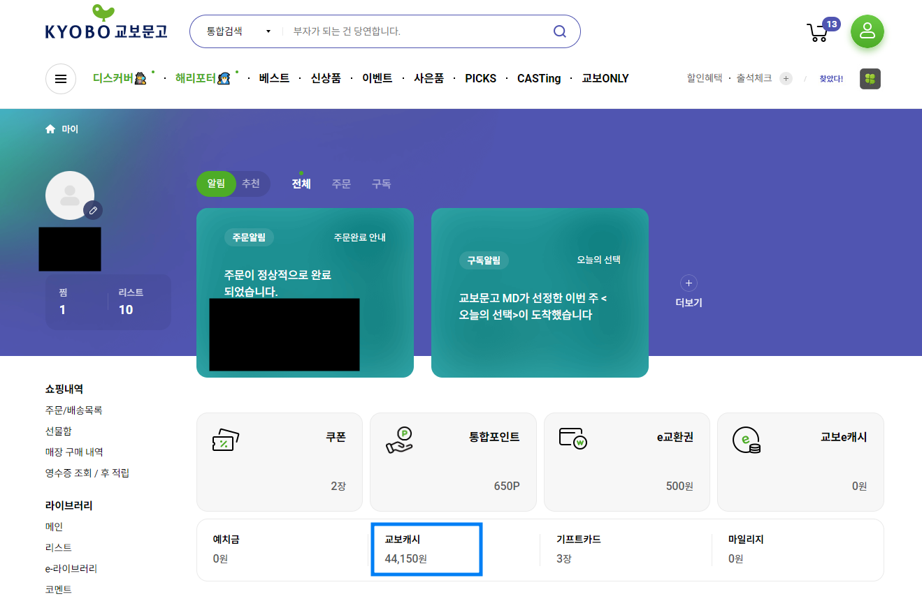 그러면 우리는 이제 교보캐시를 충전하는 방법을 알아보겠습니다. 교보캐시는 홈페이지나 어플을 통해서 충전할 수 있는데 저 같은 경우는 교보문고 출석체크 이벤트도 매일 참석하고 있어서 어플을 통해서 충전을 합니다. 교보문고를 자주 사용하신다면 매일 진행되는 출석체크 이벤트를 참석하면 매월 2천 원 정도의 쿠폰을 받을 수 있으니 참고하시길 바랍니다.