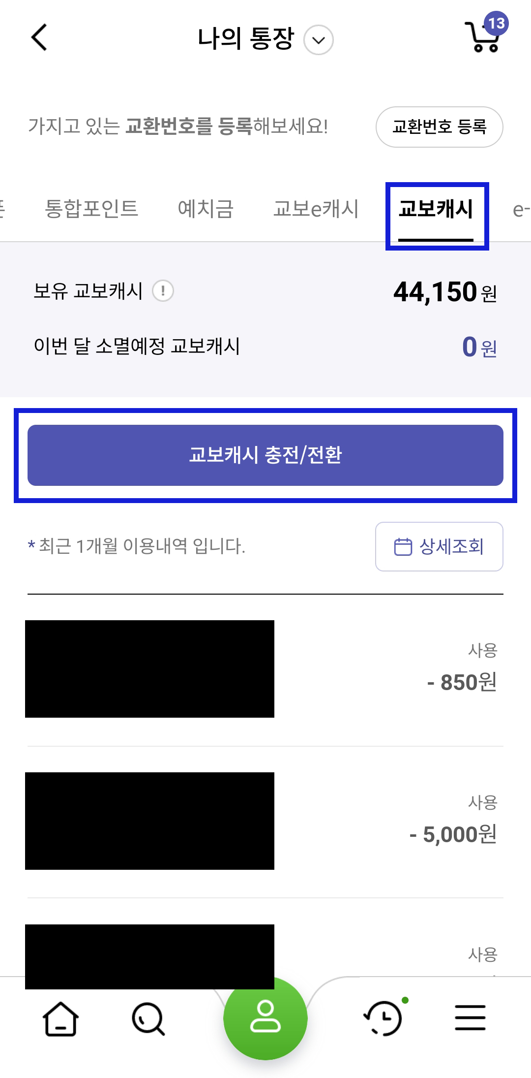 나의 통장에서 상단 메뉴를 옆으로 밀면 교보캐시가 나옵니다. 교보캐시를 터치하시면 현재 보유한 캐시와 사용 내역을 볼 수 있습니다. 저희는 충전을 하러 왔으니 가운데 있는 교보캐시 충전/전환 버튼을 터치합니다. 그러면 이제 충전화면이 나옵니다. 짭모아 때문에 충전을 하는 것이니 5000원을 입력해 주시고 결제수단을 신용카드로 선택하셔서 충전하시면 됩니다.