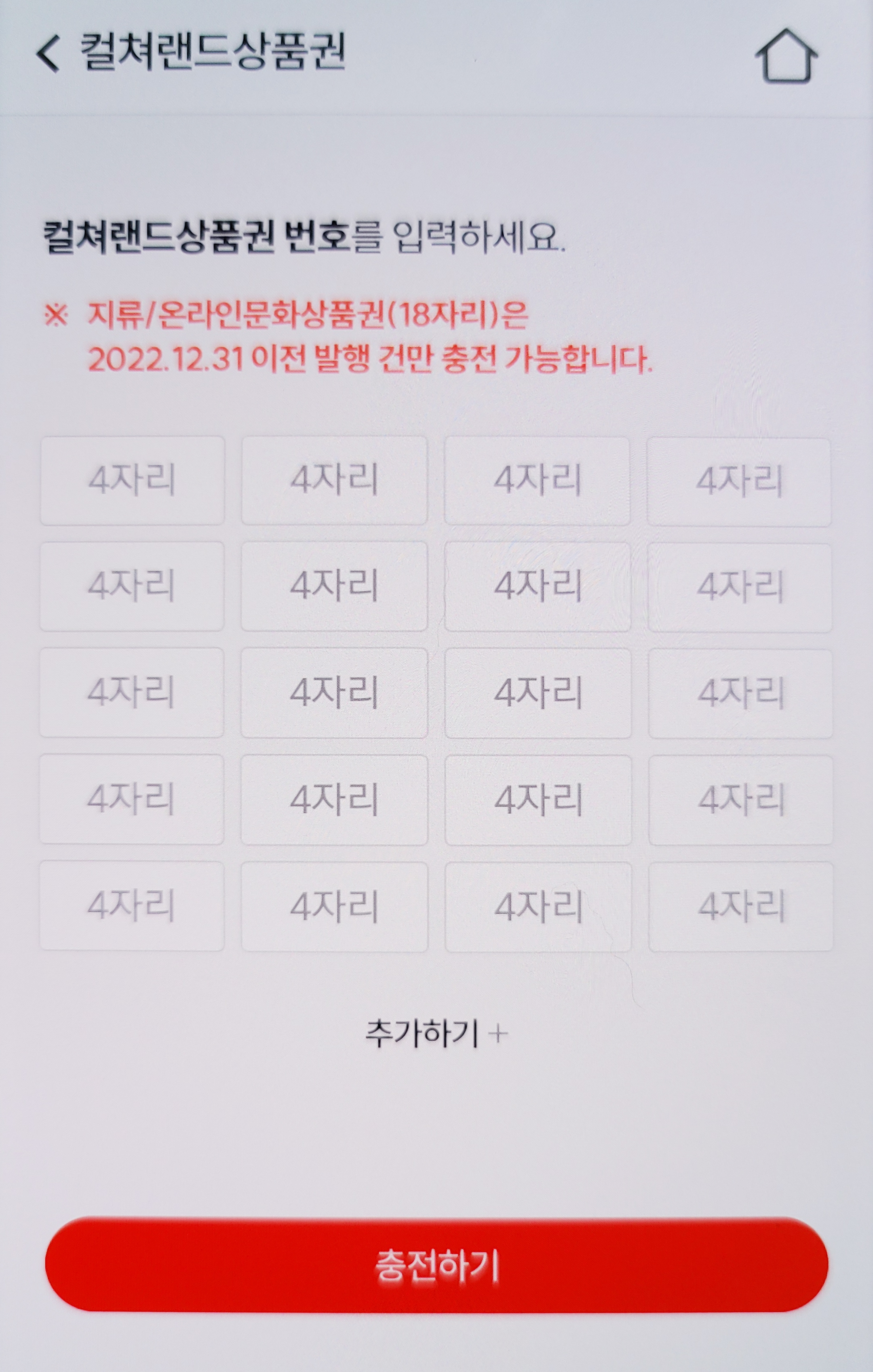 - 어플 실행 > 하단 충전 터치 > 컬쳐랜드 상품권 터치 > 핀번호 입력 > 충전하기 터치