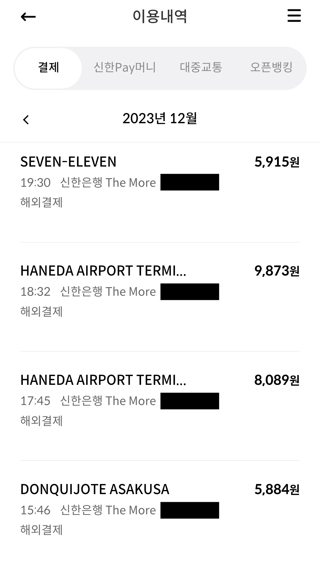 실제로 제가 결제한 내역입니다. 같은 날 돈키호테를 방문했는데 한 번은 아사쿠사, 한 번은 시부야 돈키호테를 갔습니다. 각각 거래처명이 다르게 뜬것을 확인할 수 있습니다. 때문에 다른 지점만 간다면 여러 번 적립을 받을 수 있습니다.