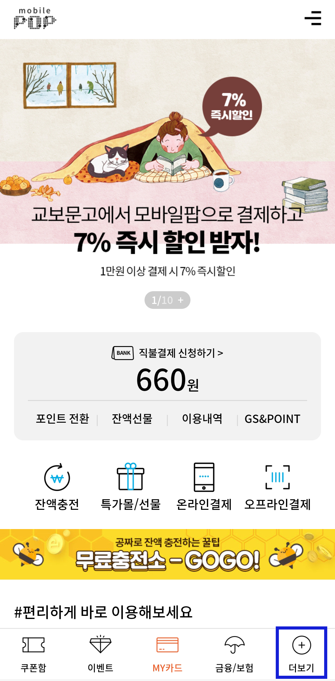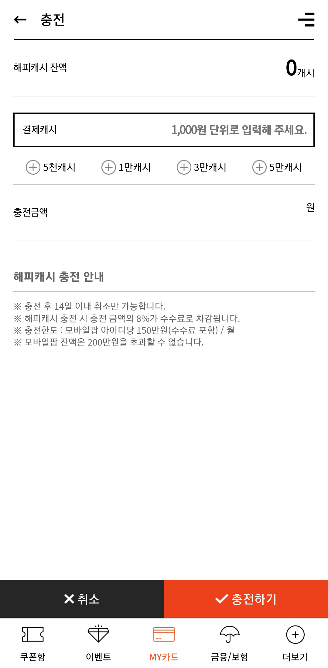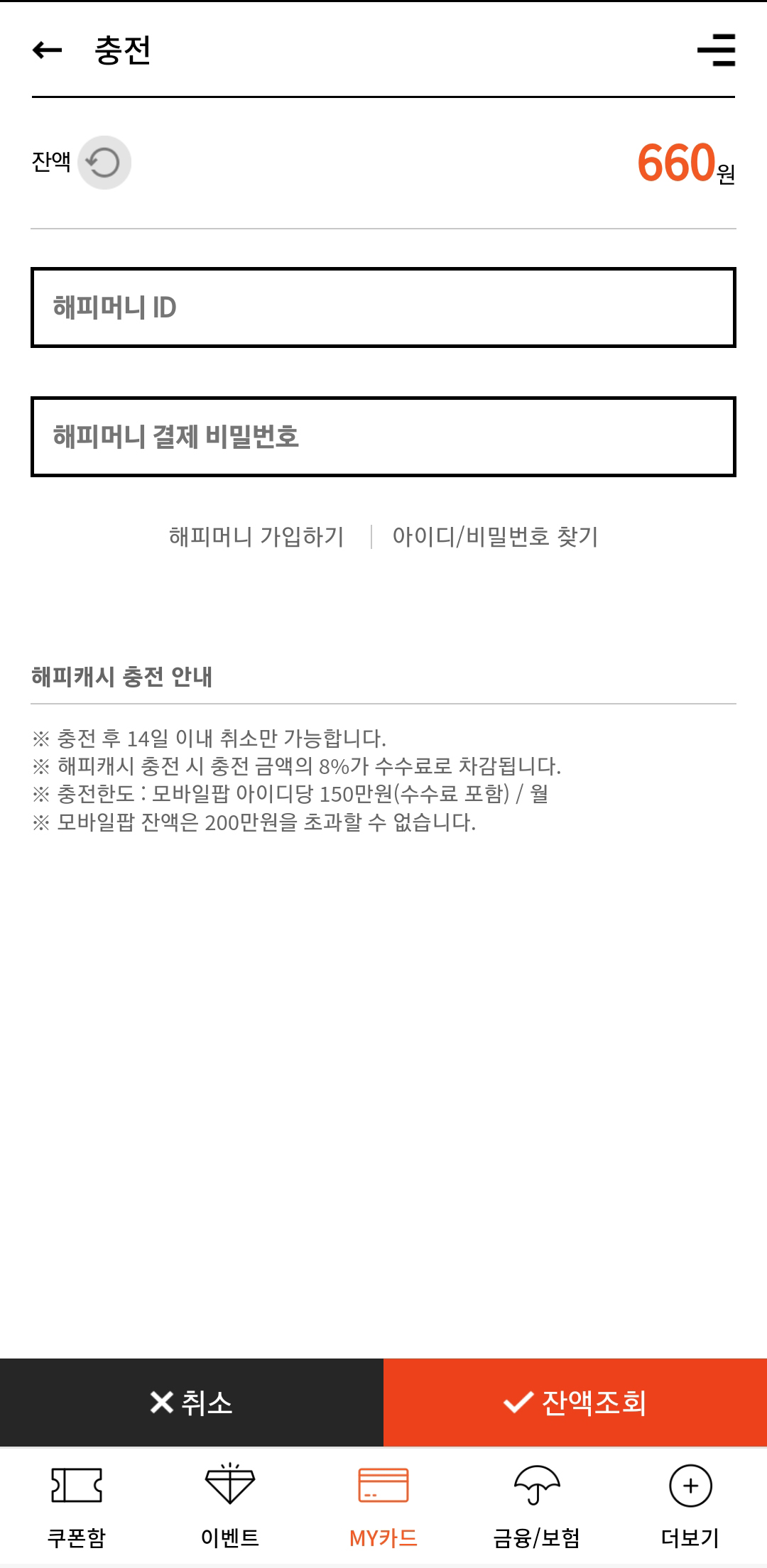 모바일팝 어플을 실행해서 우선 회원가입을 하고 로그인을 합니다. 그럼 메인에서 잔액충전 메뉴를 확인할 수 있습니다. 잔액충전 메뉴를 터치 후 하단으로 스크롤하면 해피캐시 메뉴를 확인할 수 있습니다. 해피캐시 메뉴를 터치합니다.