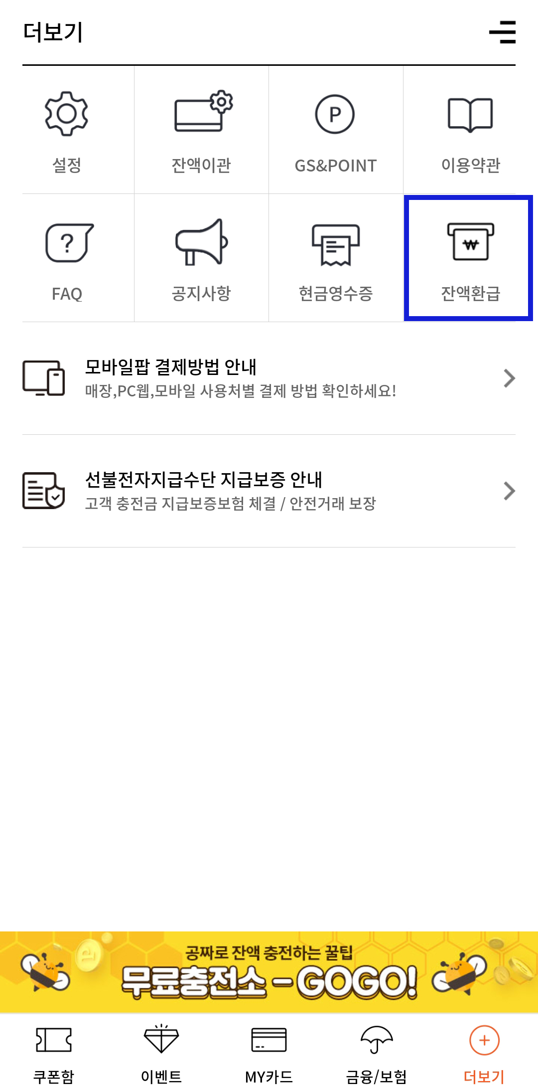 충전된 모바일팝을 이제 현금화해 보겠습니다. 모바일팝 현금화 서비스는 월~금요일에만 가능하며, 주말 및 공휴일은 불가능하니 평일에 꼭 까먹지 말고 현금화를 하셔야 합니다. 우선 하단의 더보기를 눌러줍니다. 더보기 페이지에서 잔액환급을 눌러 현금화를 진행합니다. 만약 계좌가 등록되어있지 않다면 계좌등록을 먼저 해주시면 됩니다. 현금화 원하는 금액을 입력하신 뒤 등록된 비밀번호를 입력 후 환급하기를 눌러주시면 끝입니다. 현금화한 금액은 등록된 계좌로 바로 입금이 됩니다.