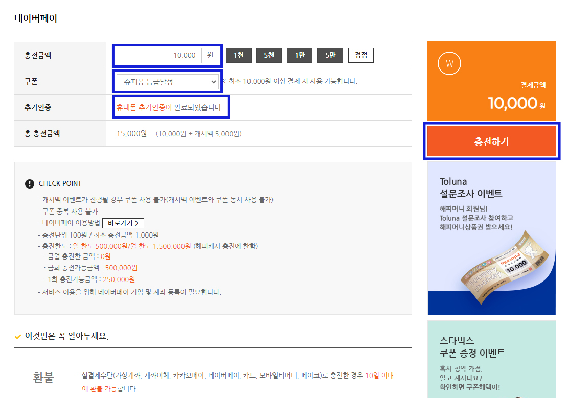 저는 네이버페이로 충전을 진행했습니다. 충전금액 1만 원을 입력하고 쿠폰을 적용합니다. 추가 휴대폰 인증은 처음 한 번만 하면 되니 휴대폰 인증을 진행합니다. 그러고 나면 총 충전금액 15,000원을 확인할 수 있습니다. 이제 우측의 충전하기 버튼을 눌러 충전하면 끝입니다!