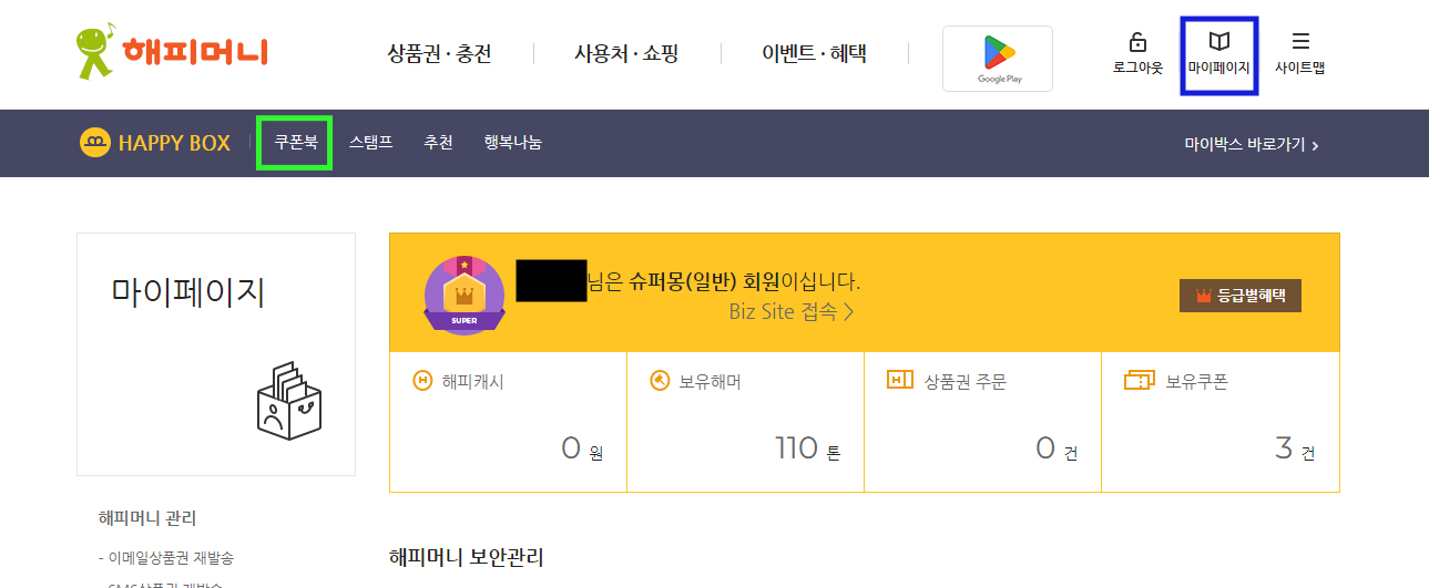 이제 쿠폰을 다운 받아보겠습니다. 앞서 말씀드렸다시피 쿠폰은 자동으로 발행되지 않아서 꼭 셀프로 다운 받으셔야됩니다. 홈페이지 상단 마이페이지를 누른 뒤 쿠폰북이라는 메뉴를 클릭합니다.