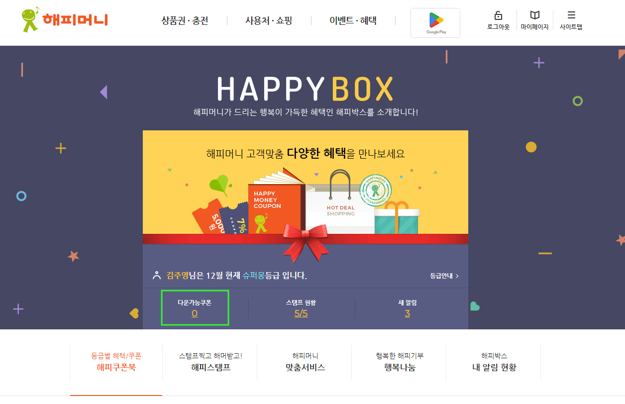 해피머니 사이트에서는 슈퍼몽 등급이 되면 5천 원 적립 쿠폰을 지급합니다. 하지만 자주 사용하시는 분들이 아니라서 등급이 낮을 수 있습니다. 그러나 실망하지는 마세요! 등급을 올릴 때마다 등급쿠폰을 주기 때문에 등급을 올릴 때마다 꼭 챙겨서 다운 받아주시면 됩니다.