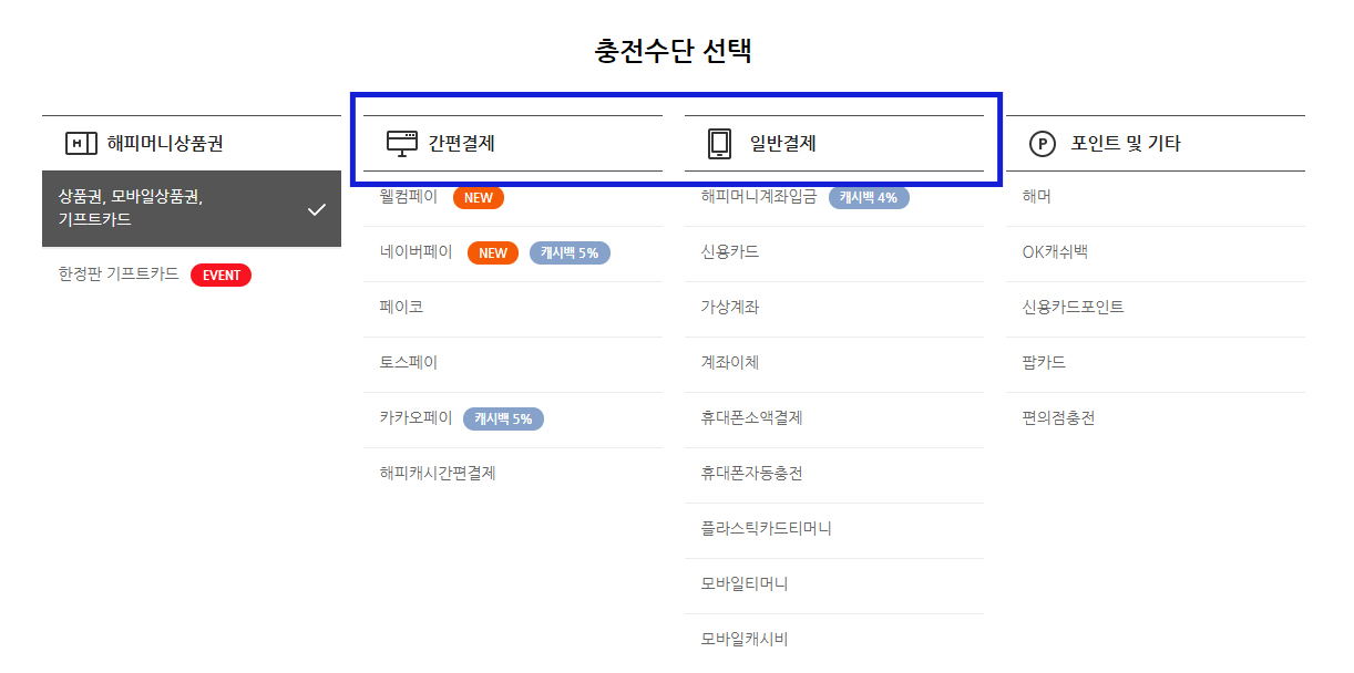 해피캐시 충전은 다양한 방법으로 가능한데 쿠폰을 사용하기 위해서는 간편결제, 일반결제에 있는 메뉴를 사용해서 충전을 진행하시면 됩니다. 충전방법을 눌러서 쿠폰적용이 보이면 쿠폰을 사용할 수 있습니다.